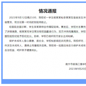 该校通报称:9月12日晚,该校初一学生杨某某和李某某在宿舍发生冲突,宿管员、班主任第一时间赶到现场阻止。