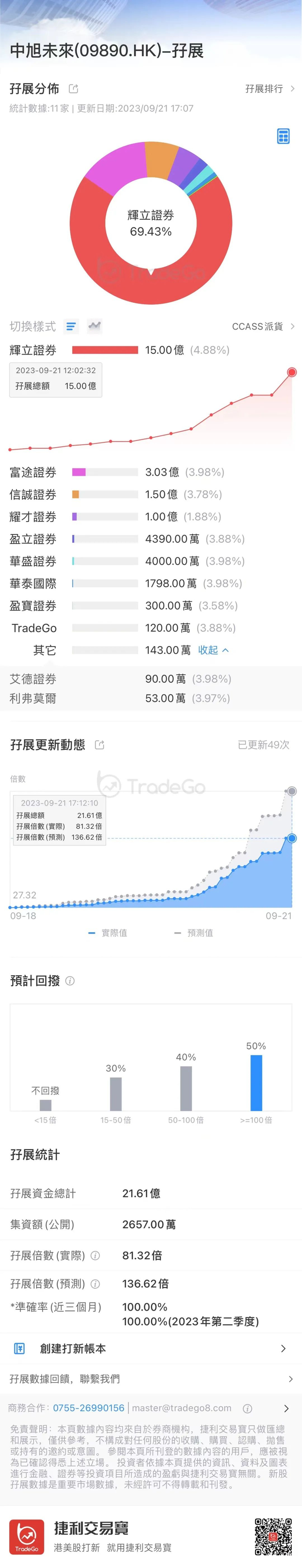 根据捷利交易宝APP数据,中旭未来目前孖展认购倍数达到81.32倍,实际认购倍数预计将超过百倍,从而触发回拨机制。