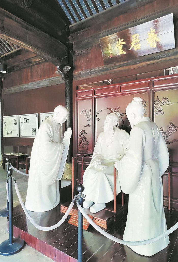 眷君堂前,东坡、维琳长老、钱世雄三人塑像