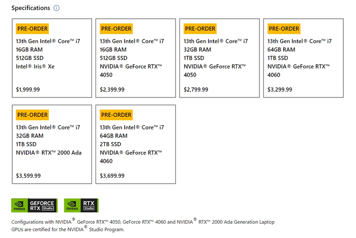 价格方面,Surface Laptop Studio 2的起售价为1999.99美元,把配置全部拉满则需要3699.99美元。