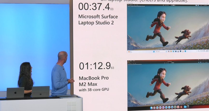 非常有趣的是,微软也在现场拿着Surface Laptop Studio 2与搭载着M2 Max芯片的MacBook Pro进行渲染任务测试。在英伟达GPU的助力下,这个项目上Surface呈现出了强一倍的表现。