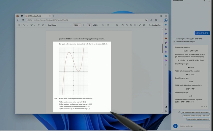 在今天的发布会上,微软还发布了一个名为Ink Anywhere的新功能。除了可以用手写笔书写数学等式提问外,手写笔还能直接选中带图片的数学问题,交给Copilot进行解答。