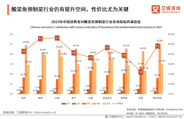 iiMedia Research(艾媒咨询)数据显示,酸菜鱼预制菜行业的满意度整体得分在4.0分左右,产品味道与口感获较高评价,但行业仍存在提升空间。预制菜生产包含研发过程,需要采取技术手段延长保存时间并减少口味上的劣势,通常价格略贵或者分量较小。面对外卖商家涌入及新品牌入驻的竞争局面,企业需加强生产线建设,减低生产成本,不断提升产品性价比,以防客群流失。