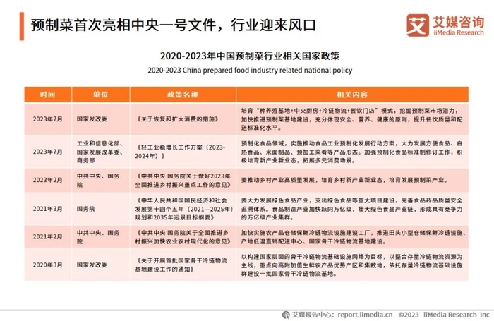 2023年2月,中央一号文件发布,提出三产融合推动乡村振兴,预制菜首次被写入中央一号文件,预制菜行业迎来更加健康、理性、蓬勃的发展。预制菜产业正当风口,正不断实现产业聚集与跨界融合。在标准化、产业化、规模化等方面,各地政府相继出台多项激励和扶持措施,推动预制菜产业高质量发展。