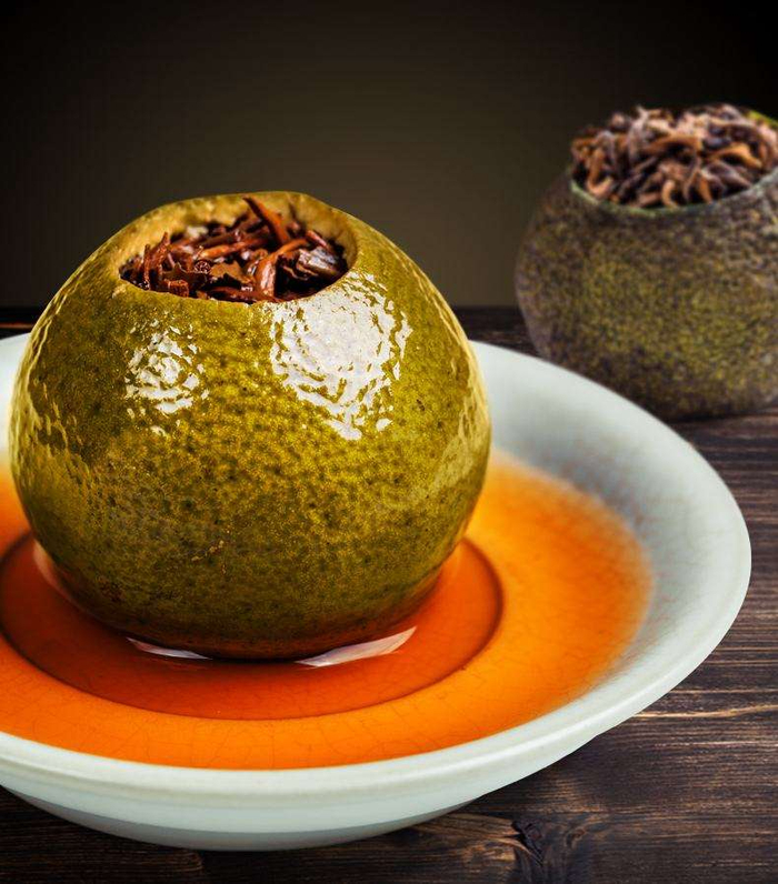 以青柑果的清香与普洱茶的厚重相融合,互相吸取各自精华继而陈化,一粒即为一泡,茶汁从柑果内部溢出,入口既能品出新会柑的柑香,也能品出普洱茶丝滑的口感。