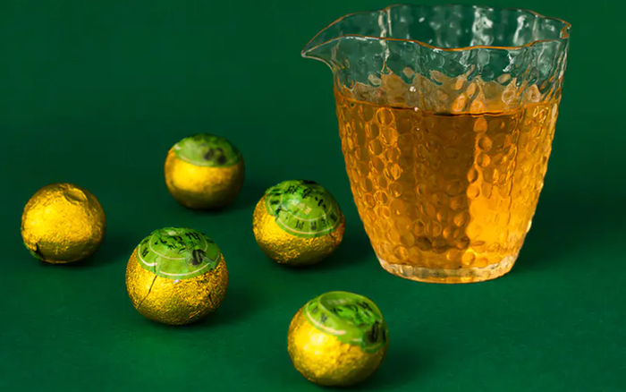 以青柑果的清香与普洱茶的厚重相融合,互相吸取各自精华继而陈化,一粒即为一泡,茶汁从柑果内部溢出,入口既能品出新会柑的柑香,也能品出普洱茶丝滑的口感。