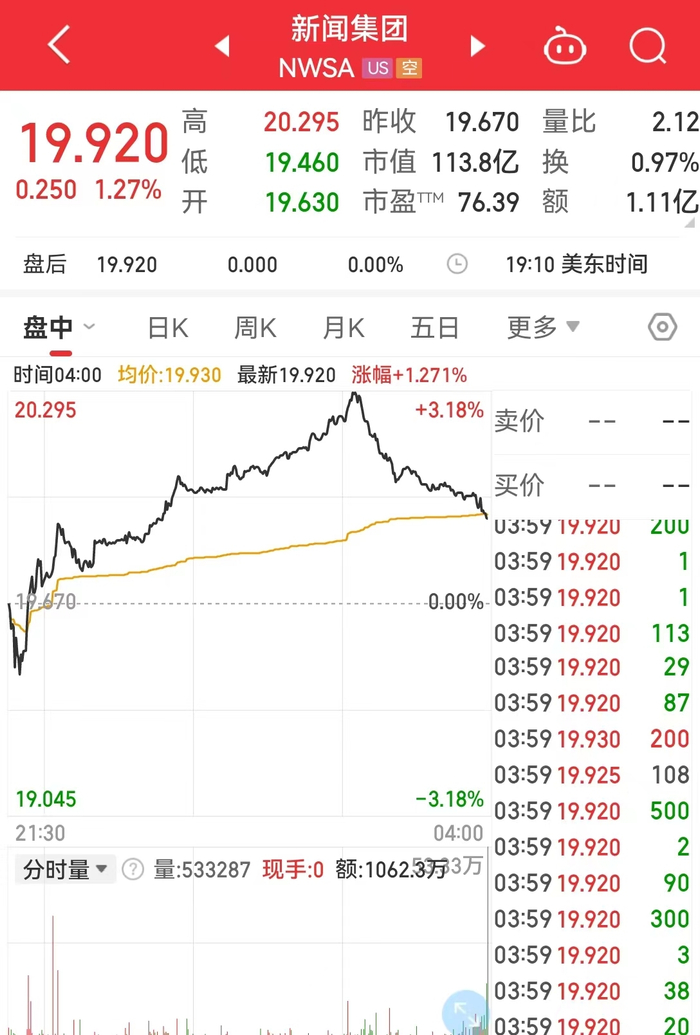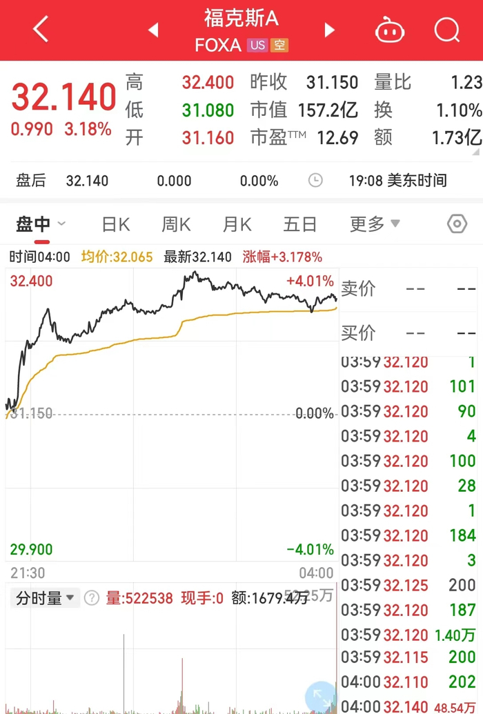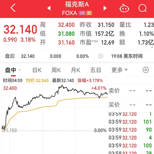 消息传出后,福克斯A股价收报32.14美元,涨3.18%,市值157.2亿美元;新闻集团股价收报19.92美元,涨1.27%,市值113.8亿美元。