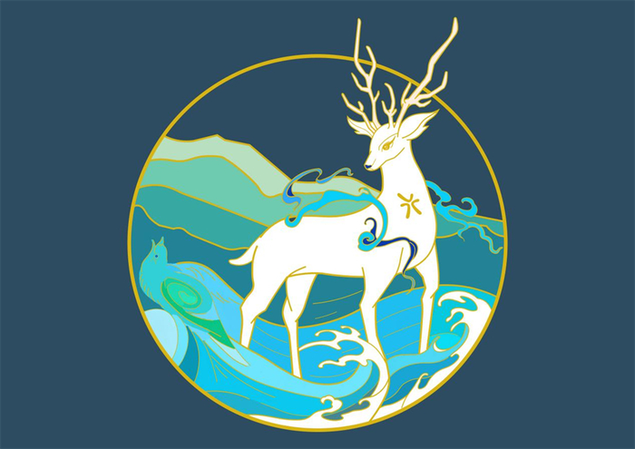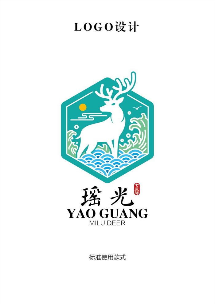 大家可以看出来,主视觉设计和LOGO设计都有着浓郁的中国风,色调以蓝绿为主,体现的是麋鹿生活的七里海湿地的环境,主视觉设计的左下方还有一只鸟,因为七里海湿地也是鸟类的天堂。LOGO上的“瑶光”二字就是这头白麋鹿的名字,取自“瑶光神鹿”的传说,代表着智慧、美丽、祥和、安宁。