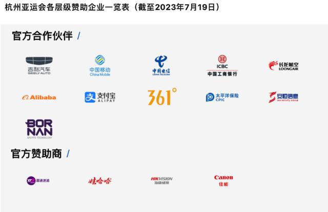 本次亚运会在杭州举行,自然吸引了大量中国企业参与其中。杭州第19届亚运会官网显示,截至7月份,杭州亚运会赞助企业已签约121个类别共176家赞助企业,亚残运会也开发完成104个类别共154家赞助企业。在这176家企业中,中国企业占据大多数,并且以消费品牌为主,其中有不少浙江尤其是杭州本土企业。