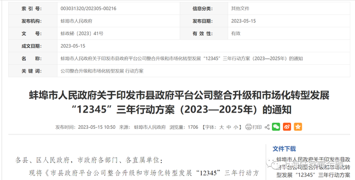 蚌埠市政府印发市县政府平台公司整合升级和市场化转型发展“12345”三年行动方案(2023—2025年)。指出,要持续优化存量债务结构,加大对短期和高成本债务的化解处置力度,积极对接有关金融机构,通过采取置换、展期等方式,进一步延长债务期限,缓解偿债压力,释放流动性风险。严控第三方资管计划等高成本非标融资规模,市属企业和各县、区政府要结合实际制定化解方案,确保存量非标融资规模“只减不增”。