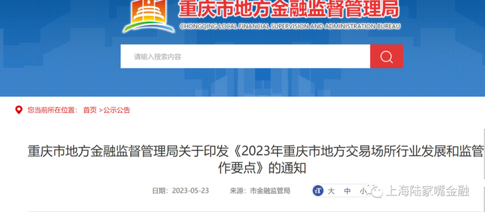 重庆市地方金融局印发《2023年重庆市地方交易场所行业发展和监管工作要点》。指出持续强化金交所监管。推动重庆金融资产交易所回归交易业务本源,严禁新增各类非标债务融资,并持续压降存量业务。扎实推进异地金交所在渝展业行为,持续督促存量业务兑付和风险化解。