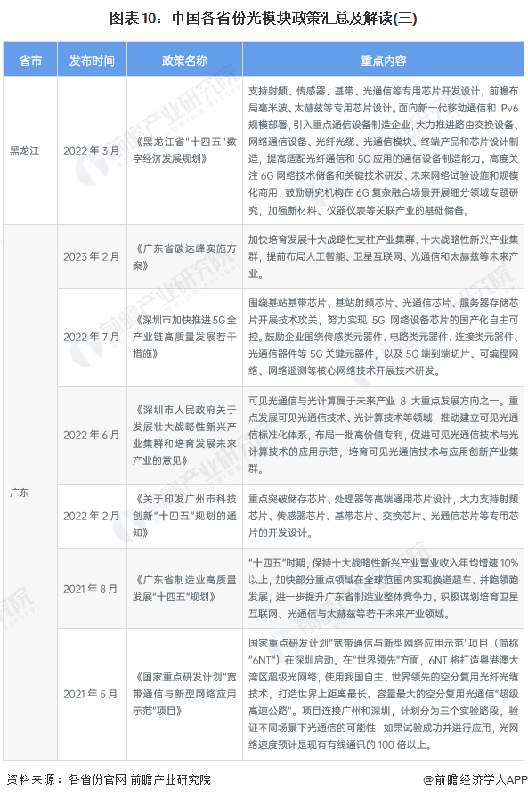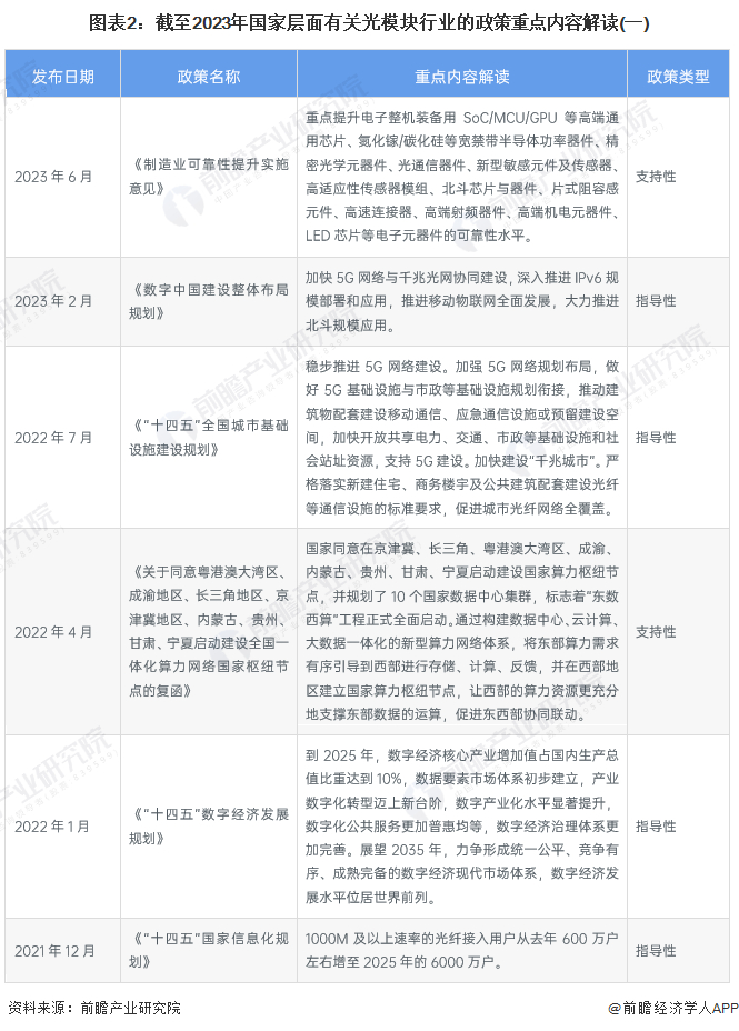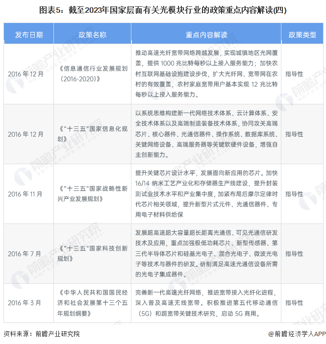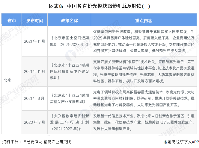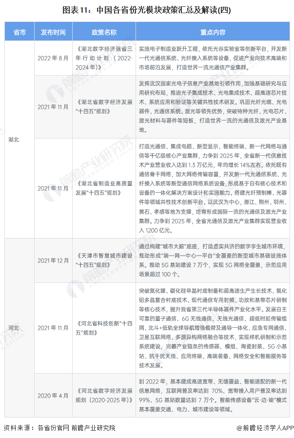 根据工业和信息化部印发的《“十四五”信息通信行业发展规划》、《“双千兆”网络协同发展行动计划(2021-2023年)》,加大光通信、毫米波、5G增强、6G、量子通信等网络技术研发支持力度,跟踪开放无线网络技术研究,加速通信网络芯片、器件和设施的产业化和应用推广。各省市也围绕“十四五”规划,纷纷出台地方光模块体系建设规划。