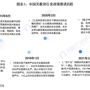 光模块是信息光电子技术领域核心的光电子器件,广泛应用于数据中心与5G承载网的建设,是构建现代高速信息网络的核心技术。中国政府颁布一系列政策支持光模块产业的发展。2018年,中国电子元件行业协会发布《中国光电子器件产业技术发展路线图(2018-2022年)》,该发展路线图量化2020年以及2022年核心光模块产品的发展规划,提岀2020年中国需实现200G、400G产品规模化生产,核心光电芯片市场30%的国产化。