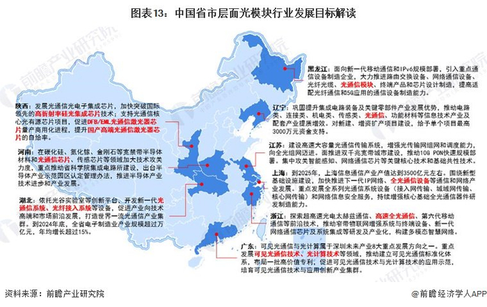 “十四五”期间,我国主要省份也提出了光模块行业的发展目标。例如,陕西提出加快突破国际领先的高折射率硅光集成芯片技术,促进DFB/EML光通信激光器芯片量产商用化进程,提升国产高端光通信激光器芯片的自给率。上海提出到2025年,上海信息通信产业产值达到3500亿元左右;围绕新型基础设施建设,加快推进下一代IP网络、全光通信设备等通信和网络产业发展。广东提出重点发展可见光通信技术、光计算技术等领域,推动建立可见光通信标准化体系,培育可见光通信技术与应用创新产业集群。其他省市也在光模块建设等方面做出规划: