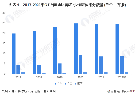 根据民政部统计,2017-2021年,华南地区中,广西养老机构床位数量快速增长,年复合增速分别为18.7%;海南养老机构床位数量供给波动较大;广东地区养老机构床位数量则在近几年保持稳定。