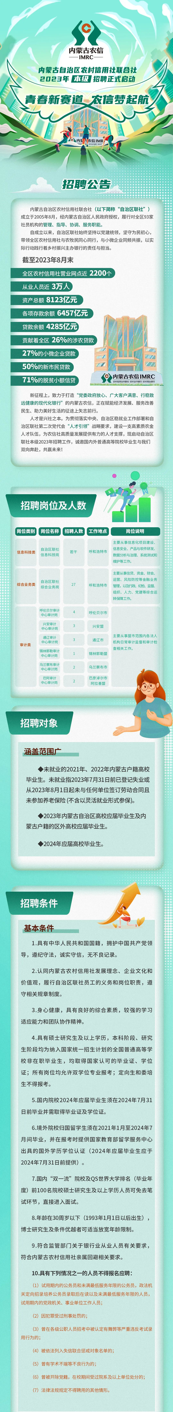 据了解,内蒙古自治区联社本次招聘包括三大类岗位,分别为信息科技类若干名,综合业务类27名,审计类15名。其中,前两类岗位的就业地点均为内蒙区联社,审计类岗位则分散于呼伦贝尔市、兴安盟、通辽市、锡林郭勒盟、乌兰察布市、巴彦淖尔阿拉善盟六地。