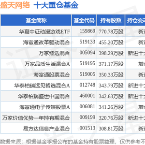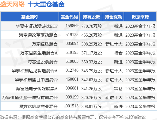 根据2023基金半年报公募数据,重仓该股的公募基金共264家,其中持有数量最多的公募基金为华夏中证动漫游戏ETF。华夏中证动漫游戏ETF目前规模为80.38亿元,最新净值1.0129(9月21日),较上一交易日下跌0.66%,近一年上涨37.81%。该公募基金现任基金经理为徐猛。徐猛在任的基金产品包括:华夏恒生ETF联接A,管理时间为2015年12月21日至今,期间收益率为0.76%;华夏恒生ETF(QDII),管理时间为2015年12月21日至今,期间收益率为1.58%;ETF联接A,管理时间为2016年12月1日至今,期间收益率为16.2%;华夏中小企业100ETF,管理时间为2016年12月1日至今,期间收益率为-1.69%。