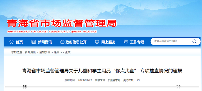 中国质量新闻网讯 9月22日,青海省市场监督管理局网站通报儿童和学生用品“你点我查” 专项抽查情况。