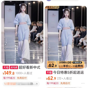 通过检索,顶端新闻记者注意到,在电商平台上,不少商家推出国风毛衣、裙子等产品,但几乎所有商家都采用AI绘画的图片进行宣传。商品标价从30元到200元不等,其中一件标价79.9元的国风毛衣被5万+人看过。