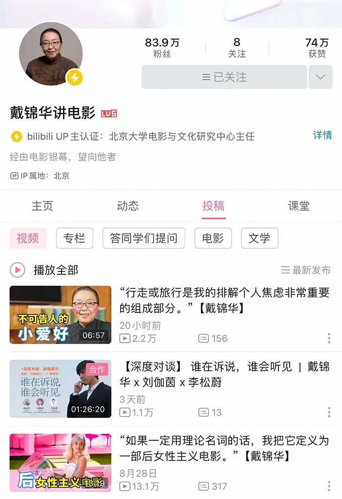 另一位学术派顶流当属戴锦华教授,这位北京大学电影与文化研究中心主任、北京大学中文系教授、博士生导师,凭借着在国内电影研究领域的泰斗级的地位以及对热门影片的专业解读,也在B站和小红书上收获百万粉丝。