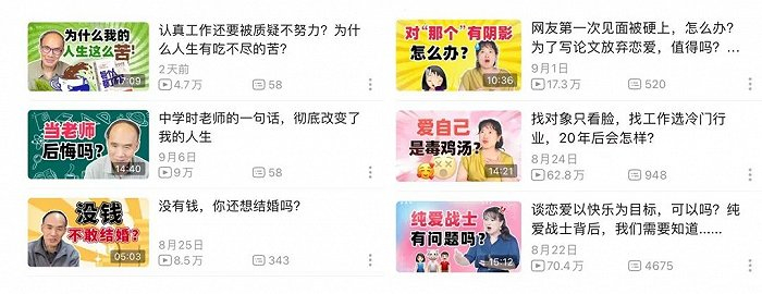 学术派的教授们则更倾向于“网红变现法”。比如梁永安与沈奕斐,这两位教授同出复旦,且都擅长社会热点分析、亲密关系梳理,他们的视频内容,从封面到文案再到话题,甚至也都有些接近。