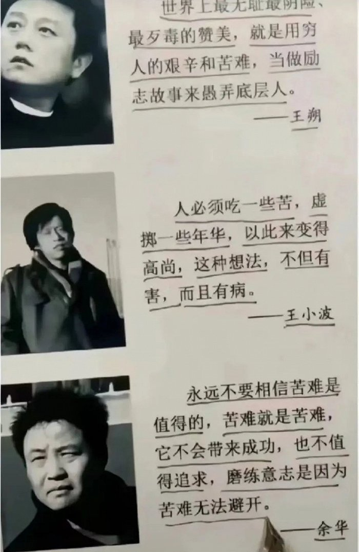 关于工作,余华说,“如果再有人来告诉你,你要努力工作,你要有上进心就会得到很好的回报,那是鸡汤,不是事实。”;关于无力感,王德峰会说,“感受无力的标准不是自己设定的成功标准,而是服从市场经济、资本逻辑的社会标准。”