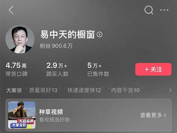其中,易中天商业化程度最高。在其置顶的三条视频中,一条是为自己的《易中天中华史》出镜带货,另外两条则是推荐罗翔的《法治的细节》和押沙龙的《读水浒》,用户也纷纷力挺,“易老师推荐必须支持!”抖音站内显示易中天带货产品已售5万+,跟买人数近3万,是所有带货作家中销量最高的。
