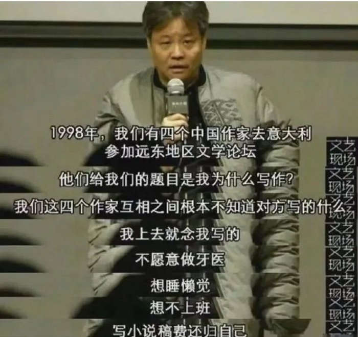 比如余华,在被问及“为什么写作”时,他说,“因为我不愿意做牙医,想睡懒觉,想不上班。”;莫言面对冯巩的起笔名请求,来了个和自己搭配的“闭嘴”;还有凭借“艺术就是装逼啊,我喜欢装逼这个词,我从小就装逼。”和“喜欢画画卧槽这拦不住的。”走红抖音的陈丹青。