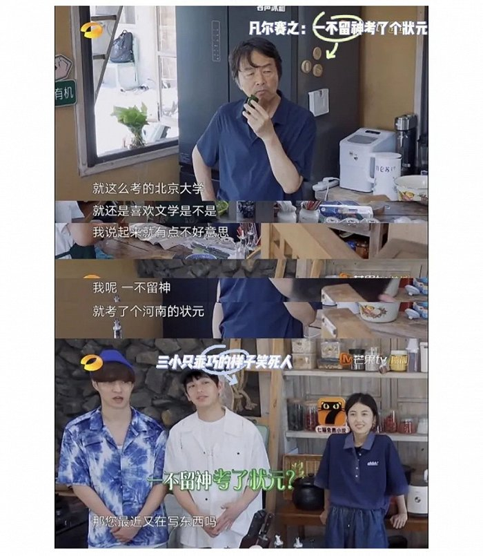 比如被问到中法作家最大的区别是什么?余华会说,法国作家用法语,中国作家用中文;给《活着》打分9.4,被问为什么不打10分,余华回答,那要问豆瓣;甚至以为采访只拍上半身,于是上身正襟危坐,下半身直接一条大短裤,一双大白腿晃悠晃悠。