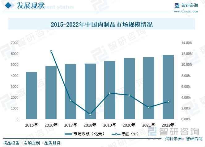 内容概况:肉制品需求和价格的增长拉动着行业市场规模持续上涨。由2015年的4350.7亿元增长至2022年的5908.68亿元,复合增长率为7.95%,呈现出价位明显的上涨趋势。如今人们不再像八九十代人们一样,逢年过节才能吃上肉,市面上充斥着琳琅满目的肉类制品,体现着国家一步步走向繁荣富强,人们的生活水平得到了质的发展。
