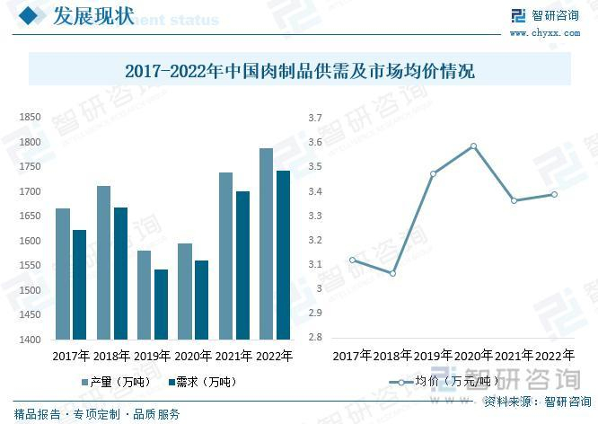 肉制品的产出直接受到肉类产量的影响。2019年、2020年肉类产量有所下降直接导致该两年肉制品的产出减少。随着人们生活水平的提高,对肉制品的需求持续增长,使得近两年行业得到快速回暖。2022年我国肉制品产量达到1789万吨,同比增长2.81%,需求量达到1743.1万吨,同比增长2.47%。目前肉制品的种类和加工工艺都得到快速提升,肉制品的市场均价整体呈上涨的态势,2022年我国市面肉制品均价来到3.39万元每吨。