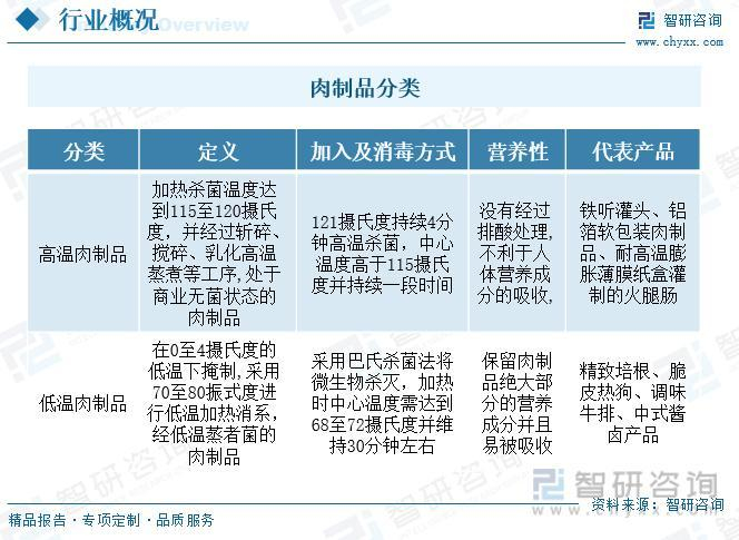 我国是肉类生产大国。肉制品大体可分为:传统风味的中式肉制品,如金华火腿、德州扒鸡、广式腊肠、南京板鸭等;以及具有中国特色的西式肉制品,如香肠、培根、肉糕、肉冻等。肉制品是指以畜禽肉为主要原料加工成的肉制成品或半成品。肉制品可以分为高温肉制品和低温肉制品。