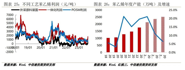 作为POSM联产的苯乙烯,其自身也处于产能扩张周期,2023年新产能基本投放完毕,年度产能增速20%,预计2024年仍有超200万吨投产,产能增速约10%。目前苯乙烯外采原料装置已时而处于亏损状态,年均开工率下降至75%以下。未来苯乙烯及环氧丙烷的亏损,POSM装置的盈利状况将发生改变,这有助于加速苯乙烯行业的产能出清。