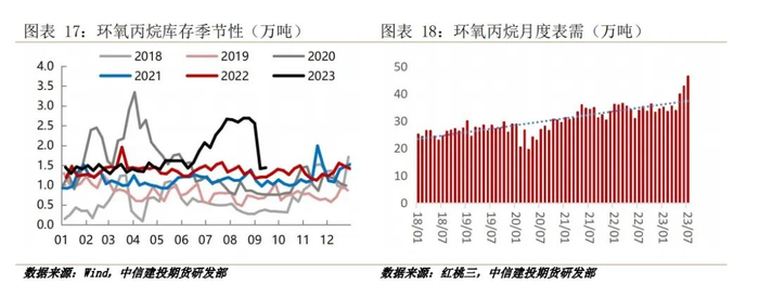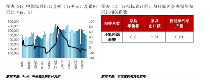 根据终端需求领域,我们对房地产竣工、汽车产量、家具零售额、家具出口额、冰箱冷柜产量等数据与环氧丙烷表需数据进行回归分析,最终发现新能源汽车产量及家具零售、出口金额与环氧丙烷表需累积同比有着较高的相关性。根据最新数据,8月家具零售额累积同比增长3.4%,新能源汽车累计产量同比增长29.6%,家具出口额累计同比下降9.9%,家具出口的疲软对环氧丙烷的需求略有拖累,但家具内需及新能源车的较好表现仍会近期促进环氧丙烷的需求。房地产竣工数据虽然与环氧丙烷表需相关性有限,但8月竣工端累计同比增长19.2%,预计其会通过刺激家具内销,间接带动对环氧丙烷的需求。
