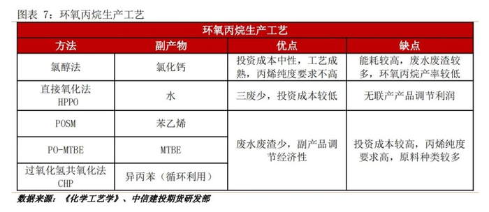 环氧丙烷生产工艺包括氯醇法、共氧化法(细分为POSM、PO-MTBE、过氧化氢共氧化法)和直接氧化法(HPPO法)。根据《化学工艺学》,氯醇法工艺单吨环氧丙烷的生产通常产生40-60吨废水及2吨废渣,污染严重。在2011年及2019年的《产业结构调整指导目录》中,均将其列为限制类别,禁止氯醇法新建项目。随着氯醇法的淘汰及共氧化法和直接氧化法的投产,目前环氧丙烷产能以POSM工艺为主(35%),HPPO法(27%)及氯醇法(26%)其次的局面。在未来新增的近420万吨产能中,仍以HPPO法和POSM工艺为主。