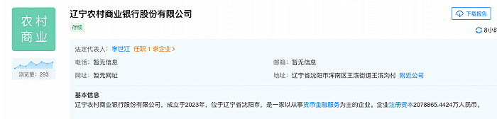 据天眼查资料显示,9月19日,辽宁农村商业银行股份有限公司成立,法定代表人为李世江,注册资本约208亿元人民币,经营范围为银行业务。