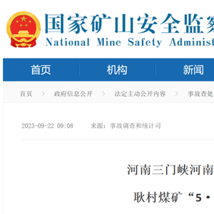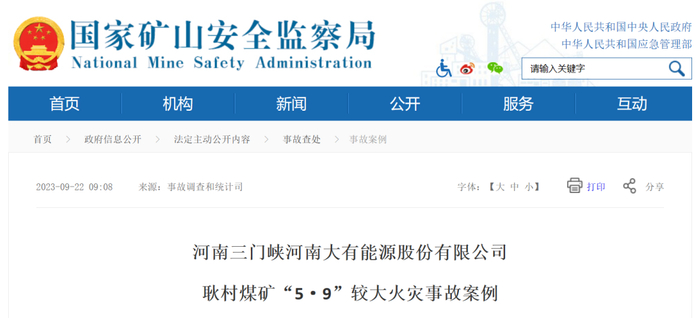 9月22日,国家矿山安全监察局发布《河南三门峡河南大有能源股份有限公司耿村煤矿“5·9”较大火灾事故案例》,对事故单位基本情况、事故直接原因、事故暴露出的主要问题以及调查处理情况进行了阐述。