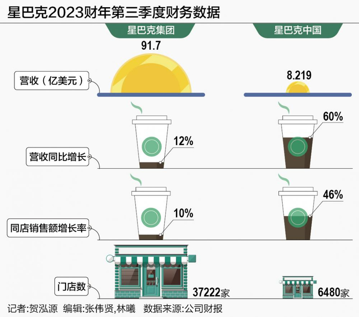 种种投入动力来自,中国市场成为星巴克发展引擎。2023财年第三季度(截至2023年7月2日)业绩报告显示,星巴克当期营收91.7亿美元,同比增长12%,不及市场预期的92.9亿美元;净利润为14.1亿美元,上年同期为9.13亿美元。同店销售额增长了10%,低于市场预期的11%。北美和国际市场的同店销售增长都低于预期,其中,北美同店销售额增长了7%,低于市场预期的8.4%;在北美以外,星巴克的同店销售额增长了24%,低于预期的24.2%。