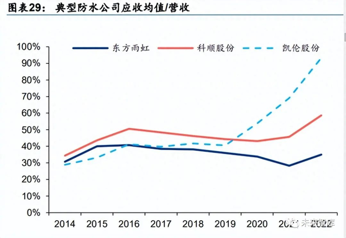 减值角度,近 3 年减值损失占营业收入比例较为稳定,基本在 2%上下波动,具体到典型 公司层面看,21 年东方雨虹/科顺股份/凯伦股份的信用减值损失占营业收入比例分别为 0.8%/3.2%/9.7%,22 年 为 1.0%/2.9%/5.9%, 绝 对 值 层 面 分 别 同 比 +15.1%/+2.7%/+274.7%、+25.3%/-10.2%/-49.7%。而收益质量层面,22 年各典型公司 收现比,除东方雨虹外均有修复,东方雨虹 22 年收现比下降,主要因为公司对于履约能 力有问题的客户,要求其优质资产进行抵账来保证现金流安全性,在会计上未当作现金处 理,因此导致表面计算出收现比下降较多。但应收账款均值占应收比例仍有较大幅度上升, 主因在 22 年收入下滑背景下,东方雨虹及科顺股份应收账款账面价值仍有提升,凯伦股 份虽应收账款账面价值规模有所缩减,但收入下滑幅度较大,造成该占比增长较多,后市 减值风险敞口仍需谨慎。