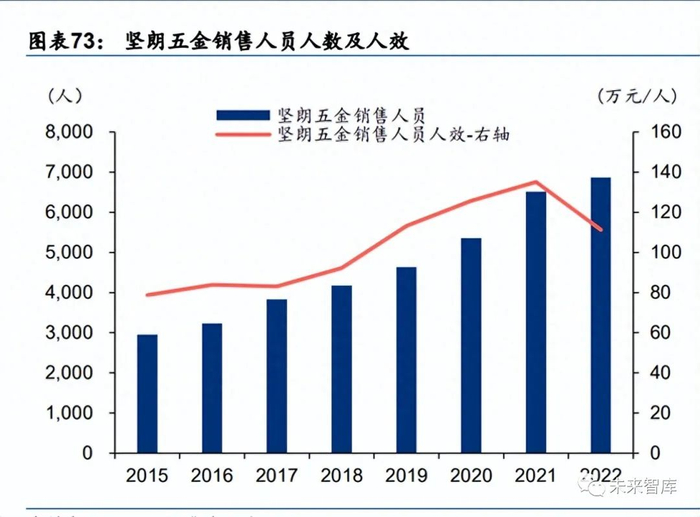 13-17 年,渠道铺设期,坚朗五金销售费用增速显著高于营收增速,18 年二者增速匹配, 19 年起销售费用增速显著下降,低于公司收入增速,但在此期间销售人员人数仍在增长, 但 15-21 年公司人效保持快速增长。根据销售费用拆分,其中 70%来自于人员薪酬,销售 人数方面,22 年虽仍有增长,但增速显著放缓,同比+5.4%,为近 7 年最低增速,根据调 研,23 年公司计划精简人员,目标相较 22 年底同比-5~-10%,结合人效修复下,对净利 率或有 1pct 以上的增厚作用。