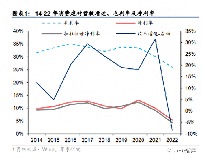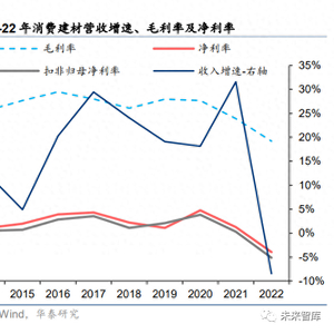 2)消费建材板块整体角度出发,同比变动角度看,重点关注毛利率、期间费用以及减值 的同比修复。15-16 年归母净利率提升主要源于毛利率的持续修复所致,17 年虽毛利率下 行,但收入同比增长有效摊薄费率,带来净利率的进一步上升,18 年毛利率延续下行趋势, 然而销售费用绝对值提升,销售费率反弹加深盈利能力下滑;19 年受北新建材诉讼事件影 响,整体净利率有所下滑,若剔除当年因石膏板诉讼案造成的营业外支出 19.3 亿元影响, 实际归母净利率测算为 11.6%,同比+0.7pct,20 年剔除销售费率中运费重分类至营业成 本造成的影响,毛利率重回修复赛道,净利率重回正常区间;21-22 年,能源及大宗商品 大幅涨价下,毛利率深跌,叠加 22 年地产债务危机、经济波动,营收 10 年内首次出现负 增长,费用摊薄效果削弱,各企业同时大幅计提减值,使得净利率连续下滑。