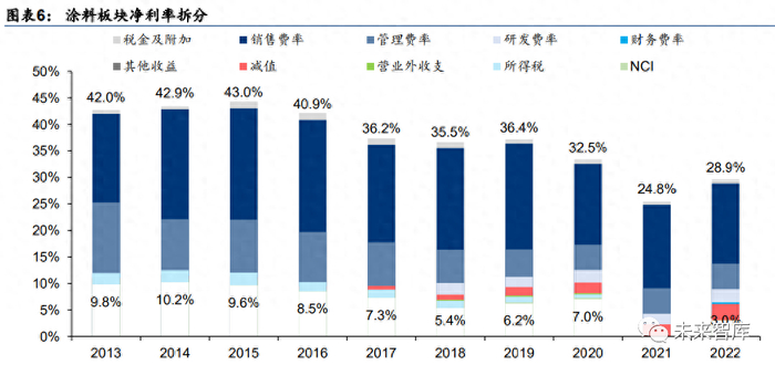 涂料板块净利率基本与毛利率同向波动,受成本、市场竞争影响较大,减值风险在 21 年 或已充分消除,22 年报表修复已现: 1) 涂料板块净利率主要受毛利率影响较大,近 10 年整体毛利率呈现波动下降趋势,16 年以前基本维持在 40%以上,17 年跌破 40%,近两年在 30%上下波动,下降约 10pct,极差为 18.9pct(15 年最高达 44.3%,21 年最低至 25.5%);刨除 20 年由于 运输费用重分类造成的毛利率下降外,净利率基本保持与毛利率的同向变动,近十年 从最高 10.2%下降至最低 3.0%(剔除 21 年减值造成的亏损影响),整体幅度小于毛 利率下降幅度,主要原因在于过去收入规模快速扩大带来的费用项有效摊薄;21 年原 材料成本高企,致使典型公司毛利率受较大冲击; 2) 销售费率即使剔除运费影响后仍稳定在 15%以上,对净利率影响较大;管理费用则较 为稳定,近三年维持在 4.8%。 3) 21 年下游地产资金周转困境使得计提减值占比同比上升 8.1pct 至 10.13%,叠加毛利 率下滑,板块出现亏损,22 年或因减值风险敞口前一年已暴露较为充分,减值占比下 滑 7.1pct,板块扭亏为盈,板块整体减值高峰或已过。