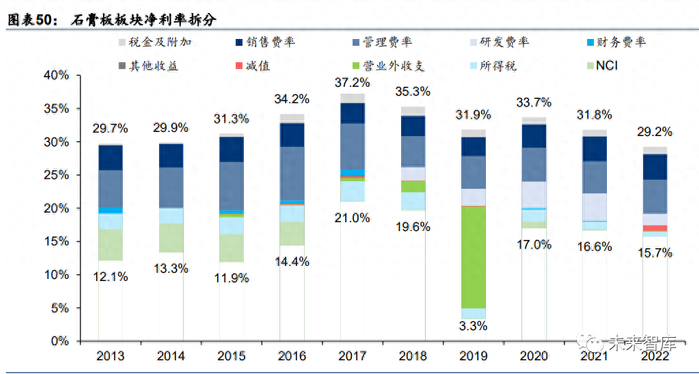 石膏板板块北新建材市占率较高,抗周期性强,报表层面持续保持稳健,经营效益持续改 善,净利率主要受成本端变动影响: 1) 截至 22 年末,以销量记北新建材市占率达 68%,具有较强的市场话语权和上下游议 价能力。近 10 年毛利率呈现先升后降趋势,基本围绕在 30%上下波动,19 年毛利率 下滑主因当年公司即按照新会计准则要求将运费重分类至营业成本,剔除该影响后, 毛利率主要受成本端影响,但受益于公司市场地位,整体控价能力较好,毛利率波动 相较成本侧更为平稳; 2) 同板材板块一样,剔除运费影响后,销售费率与管理费率绝对值分别在 4%/5%左右波 动,除会计口径变化原因外,长期维持稳定; 3) 由于北新建材过去收购泰山石膏并持有其 65%的股份,造成 17 年之前有较多的少数 股东损益影响其归母净利率,16 年 10 月公司收购剩余 35%股权,使得少数股东损益 造成的利益流出大幅缩减,促使毛利率与净利率之间差额进一步缩小,刨除美国石膏 板诉讼案件外,经营效益基本保持稳定; 4) 受地产危机影响,22 年减值占比小幅提升 0.7pct 至 0.8%,但总体对净利率扰动较小。