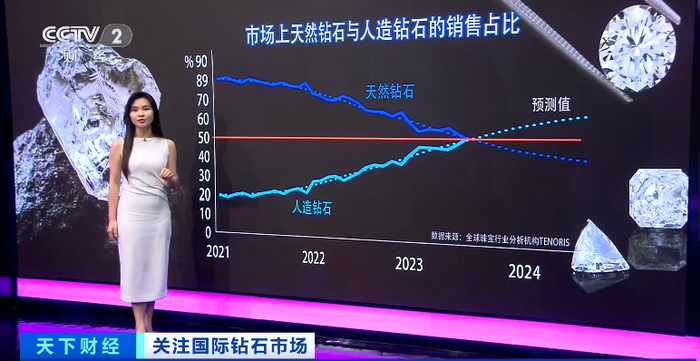 据全球珠宝行业分析机构Tenoris汇编的数据,人造钻石的市场份额自2021年以来不断提升,今年7月,市场份额已经达到了49.9%,已经非常接近50%的临界点,而预计未来还会进一步走高。