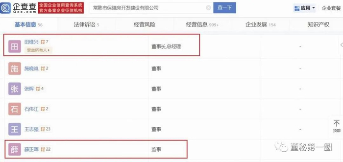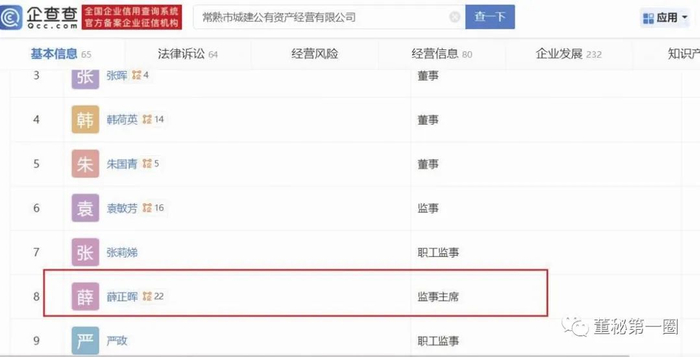 同时在大客户任职的中法水务董监高并非金科一人。企查查显示,中法水务董事薛正晖同时担任常熟江南水务董事(见图二),且为保障房公司现任监事(见图三);此外,其还在控股股东城建公司担任监事主席(见图四)。