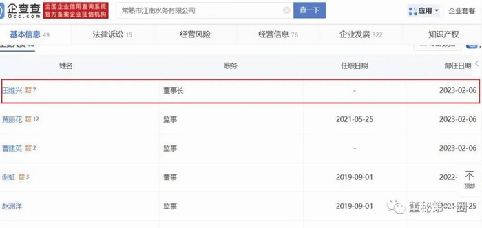 此外,中法水务现任监事会主席田维兴此前还曾担任常熟江南水务董事长,直到2023年2月才卸任(见图五);目前兼任保障房公司董事长、总经理。据招股书披露,“田维兴,监事会主席,男,1977年9月出生,中国国籍,无境外永久居留权,本科学历,工程师。2002年参加工作,2002年至2004年任中铁五局集团第三工程有限责任公司经营部科员,2004年至2009年任常熟市市政建设工程监理咨询有限公司工程监理,2009年至2013年历任常熟市房屋征收管理办公室科员、副科长、科长,2013年至今历任保障房公司科长、总经理助理、副总经理、总经理、董事长,2018年至今历任城投公司副总经理、总经理、董事长,2020年3月至2022年10月任恒信智地董事长。2022年10月起至今任国投公司董事长、总经理。2015年起至2019年7月任公司董事,2019年8月起至今任公司监事会主席。”