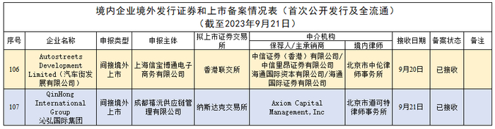 汽车街、沁宏国际,拟香港/美国上市,在中国证监会备案 (截至 20230921)