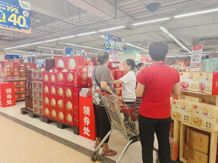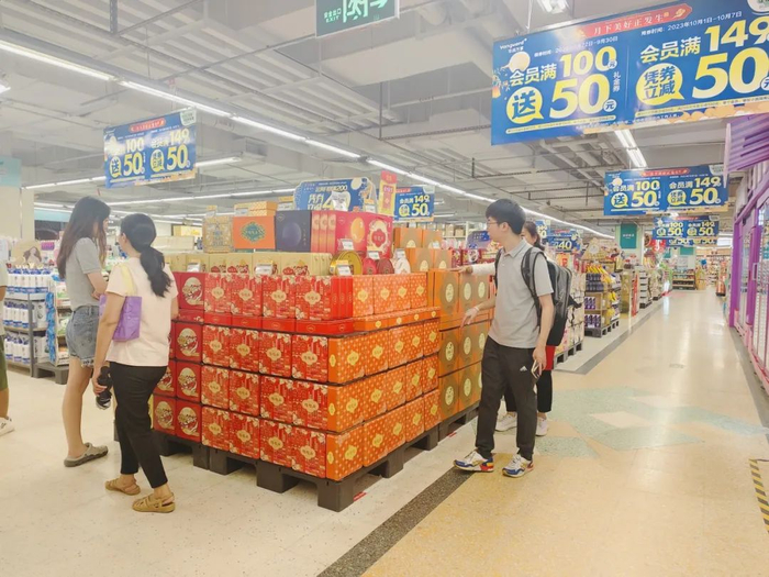 在华润万家门店,广州酒家、美心、元朗荣华、金九、华美……各品牌月饼堆头组成的月饼一条街相当“架势”,而且各品牌都推出了满减优惠,叠加双节大促,吸引了众多街坊选购。