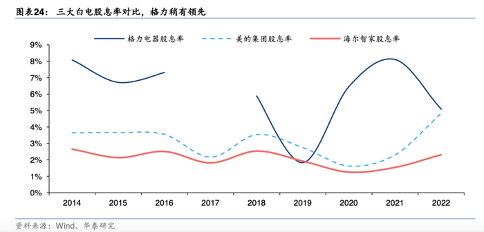 根据华泰证券4月30日研报整理数据,白电龙头中,2022年度,美的集团分红约为171.88亿元(22年度利润分配),分红率约为58.2%;格力电器累计分红约为111.51亿元,分红率45.5%;海尔智家分红约为52.98亿元,分红率约为36%。