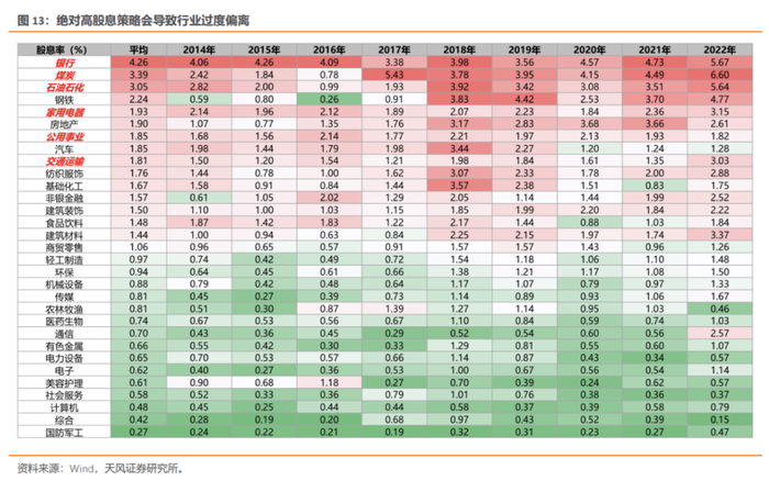 不过,张宇生进一步提到,当市场“情绪”走强时,高股息板块则通常无法获得超额收益。综合对于国债收益率走势以及未来市场情绪的判断,后期市场处于“弱现实、强情绪”的概率最高。同时,天风证券刘晨明等人在9月17日研报中提示称,A股很多时候会出现高股息陷阱,以史为鉴,绝对高股息率策略会导致行业偏离度会非常高,核心是很多高股息股票受到总需求波动影响太大,比如红利指数的运行方向和业绩变动方向大多时候还是取决于A股整体ROE。